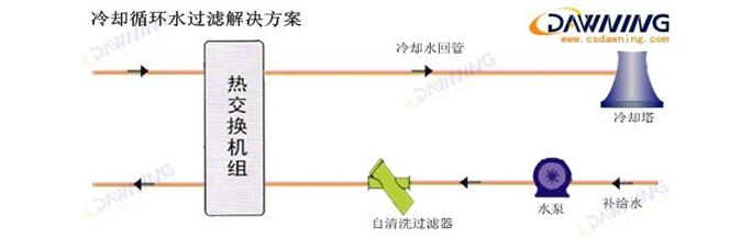 我們?yōu)槠涮峁┑倪^濾解決方案解決這一問題,如上面流程圖所示,我們在水泵和換熱器之間設(shè)備一臺自清洗過濾器(電動刷式過濾器或電動式自動排污過濾器),根據(jù)現(xiàn)場實(shí)際情況,選擇相應(yīng)的過濾網(wǎng)和過濾精度,這些將保證在不影響水系統(tǒng)正常運(yùn)行的狀況下,自清洗過濾器會過濾掉符合精度的所有雜質(zhì),并在設(shè)定的壓差或時(shí)間范圍內(nèi)自動清洗濾網(wǎng)、自動排污。自清洗過濾器的設(shè)置,將大大提高系統(tǒng)的換熱效率、減少系統(tǒng)補(bǔ)水量、提高水的濃縮比,達(dá)到節(jié)水、節(jié)能、環(huán)保的目的。